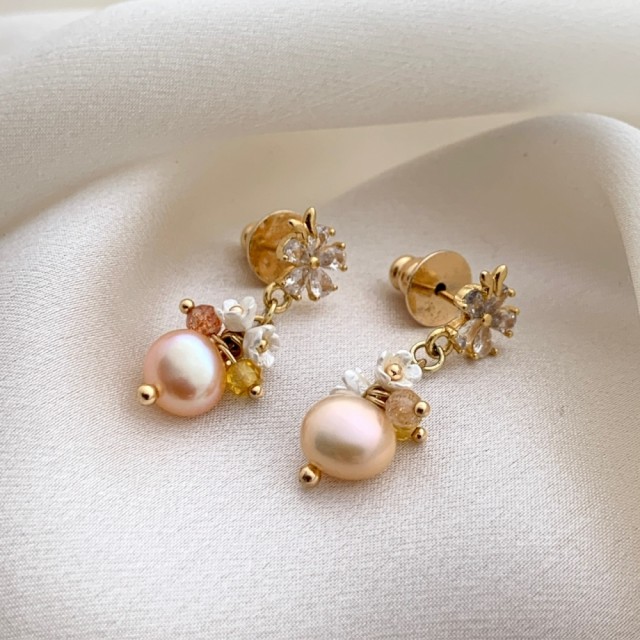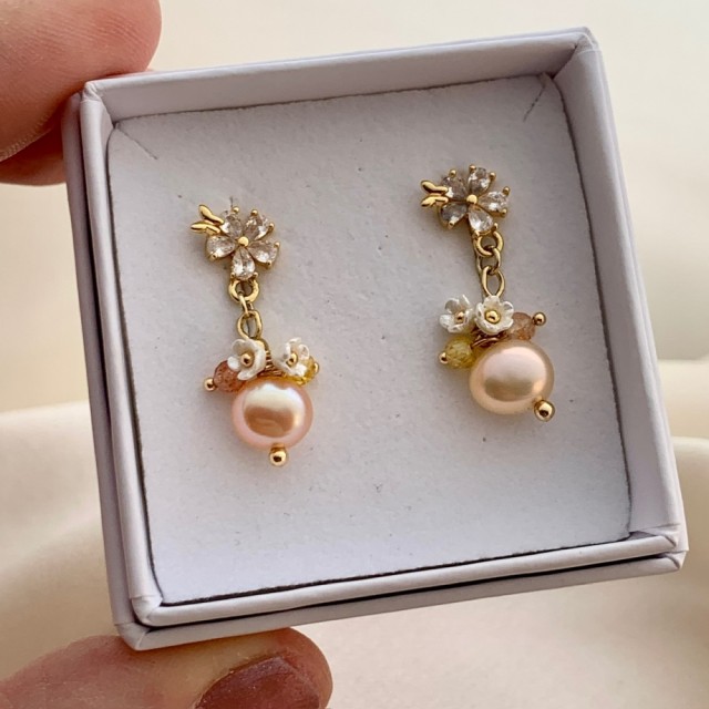 8mm ferskvannsperle i gyllen champangne med to hvite blomster. 1 SwarovskiKrystall i rosa og 1 SK i gul. Ørestikket er i 18 K gull på kobber. Ser du den bittelille sommerfuglen som har landet på zirkonblomsten inntil øret?