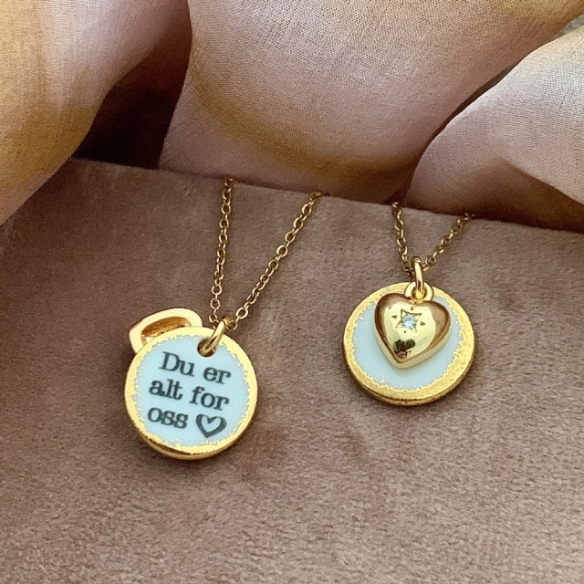 Anheng 12mm, i høybrent porselen, dyppet i 18K gull, med hemmelig beskjed på smykkets bakside, så teksten liggende nær hjertet. Gullbelagt kobberhjerte m/zirkon. Kjede 40+5 cm stainless steel, kort og gaveeske følger med. Håndlaget i Asker.